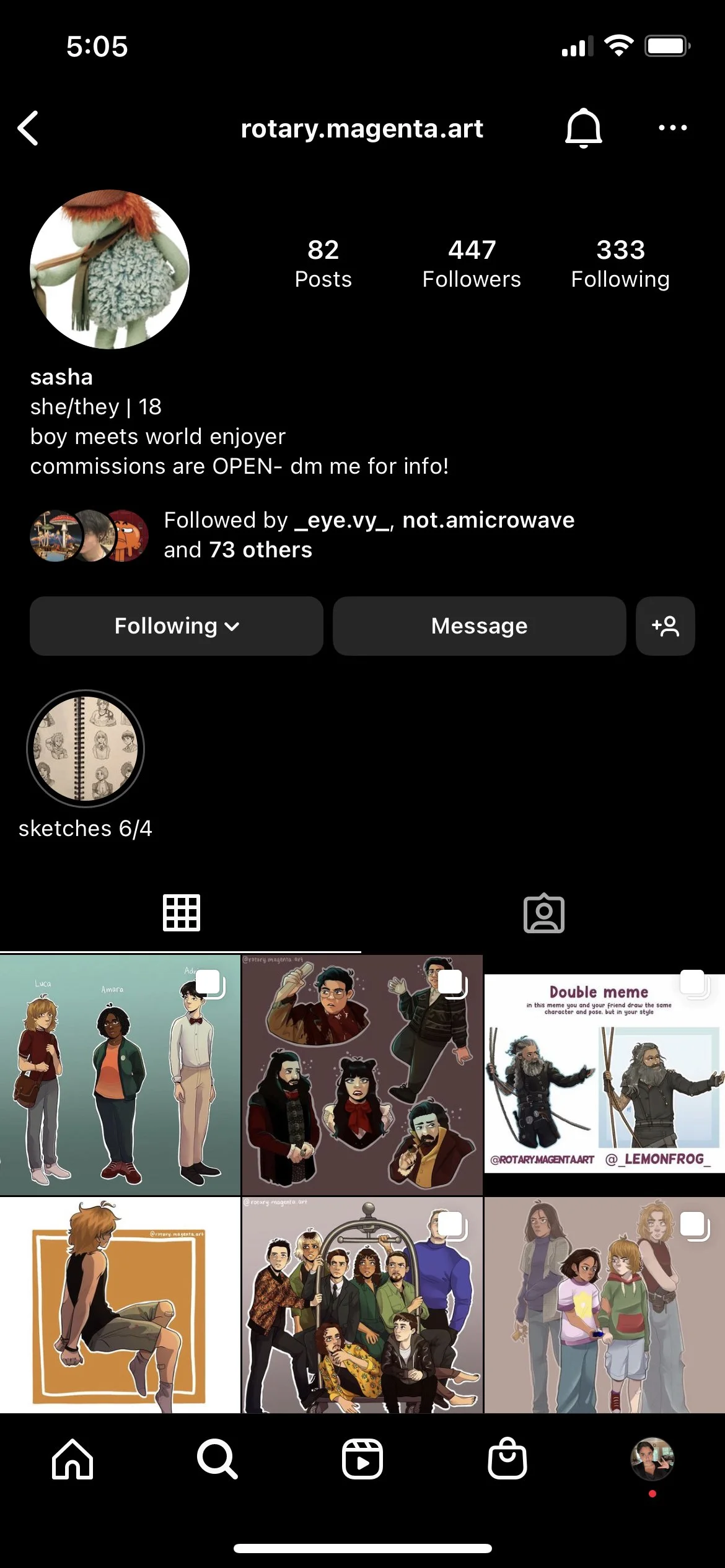 When we were assigned our second webpage, I was quick to ask another one of my artist friends. I have known Sasha for years, and I constantly saw her doodles on the edge of sheet music in choir or in the margins of her math homework. In the posts on her art account, I found diverse casts of characters from fandoms I’d never heard of. Yet, when I asked her about them, when I asked her for an interview, I was met with different answers than I had expected.